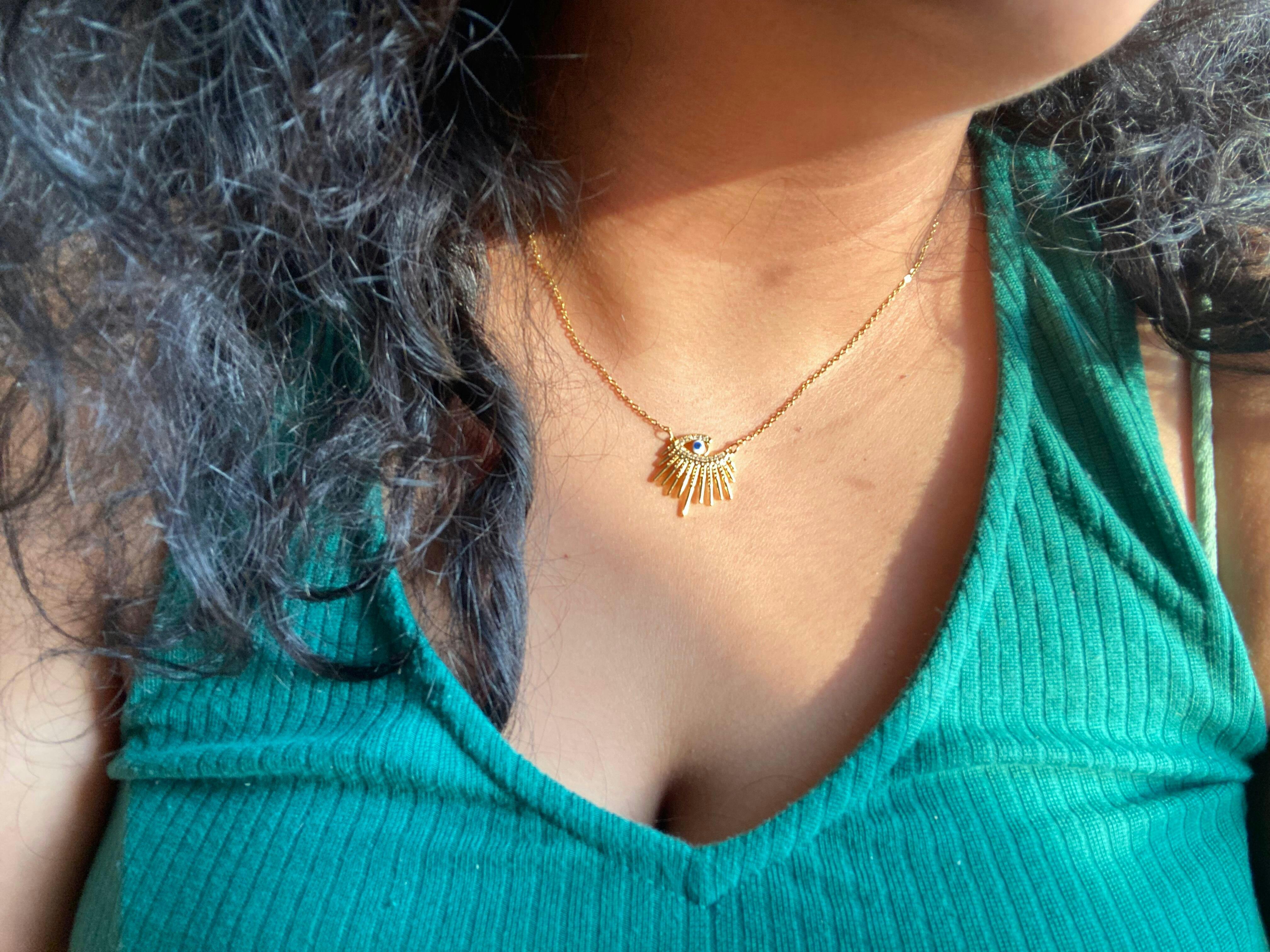 The Evil Eye Beam Necklace channels protective energy with a touch of golden brilliance. Featuring a sleek evil eye at its center, framed by striking gold rays, it radiates light and intention — shielding your spirit while elevating your everyday look.